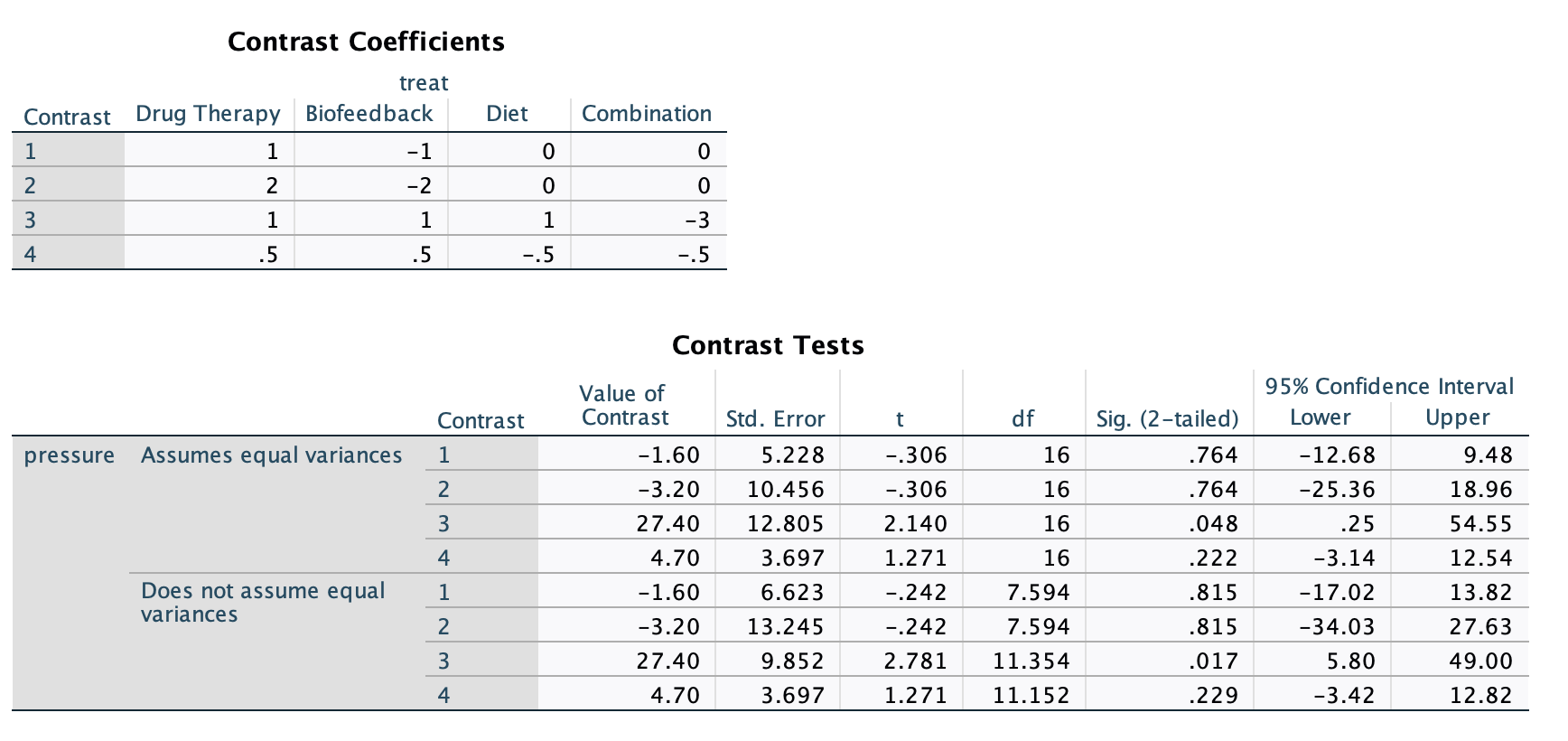There are many combinations of contrasts you might be able to think of when comparing your groups. For example, you can compare the average of drug therapy and biofeedback treatment against the average of dietary modification and combination treatments. In this case, you will just have to remember you are calculating the average of the groups you are putting together, so each one will get a fraction coefficient. If you are confused about what coefficient you should use, work backwards from the initial (\(MEAN 1 = MEAN 2\)) type equality and work back fro there.
