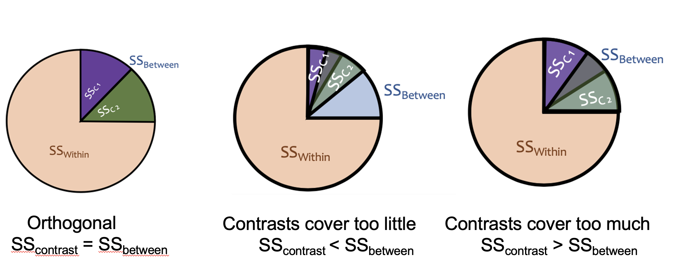 In the many cases, linear contrasts must be orthogonal. Orthogonality means that the contrasts are statistically independent of each other. This means that each contrast is testing a completely unique piece of the between-groups variability, with no overlap. Think of it like slicing a pie: orthogonal contrasts carve \(SS_{between}\) into non-overlapping slices that add up exactly to the whole pie.
