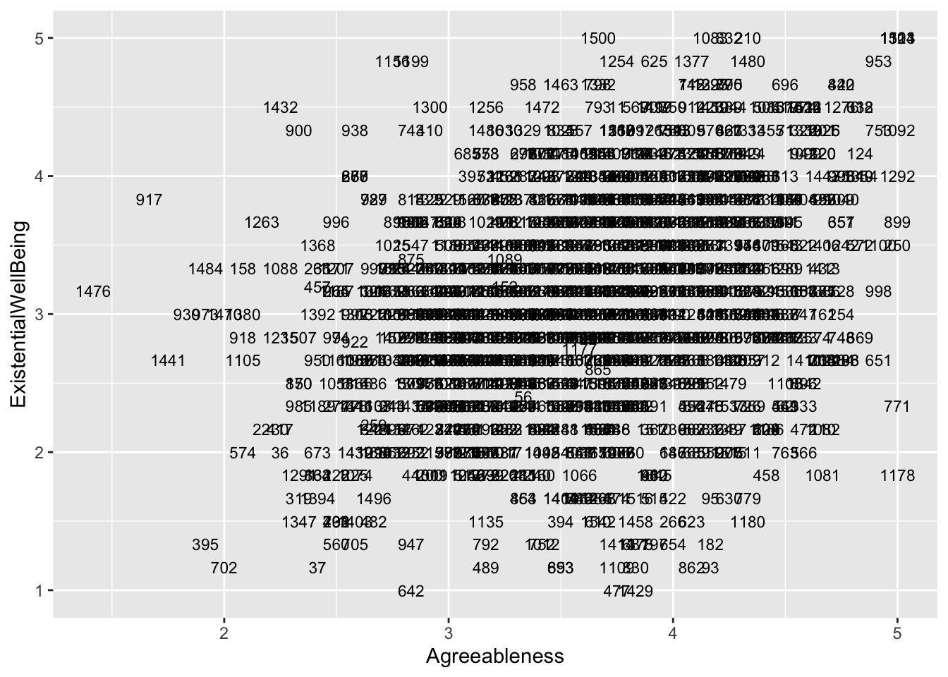 ggplot(aes(x = Agreeableness, y = ExistentialWellBeing), data = big5) +