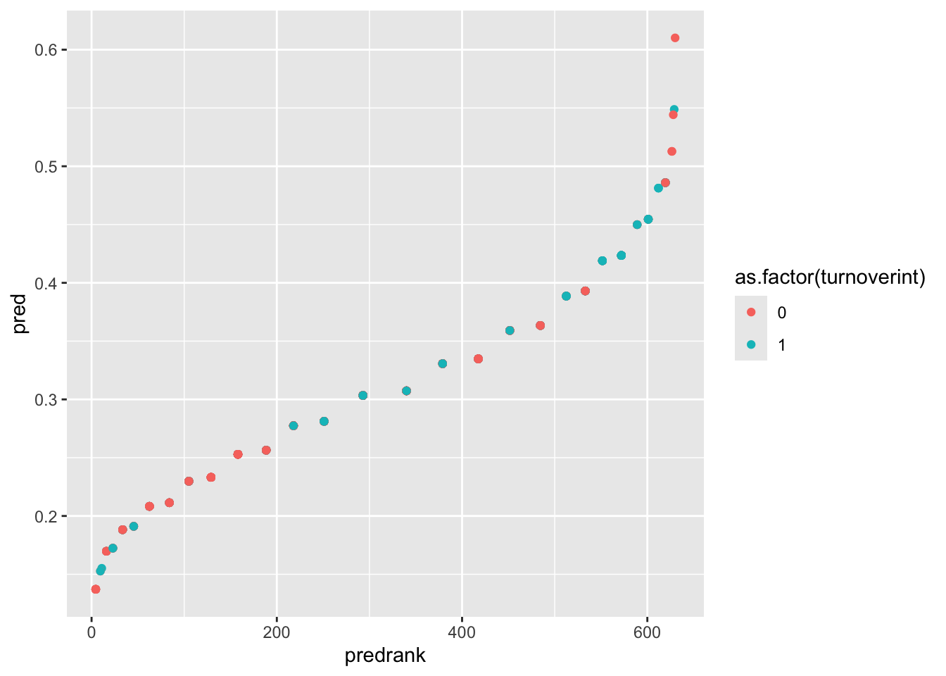 Ideally we would like to see individuals with turnoverint = 1 appearing mostly on the right side of the plot (higher predicted probabilities), while individuals with turnoverint = 0 appear mostly on the left side. If this pattern occurs, it means the model is effectively ranking higher-risk individuals above lower-risk individuals.