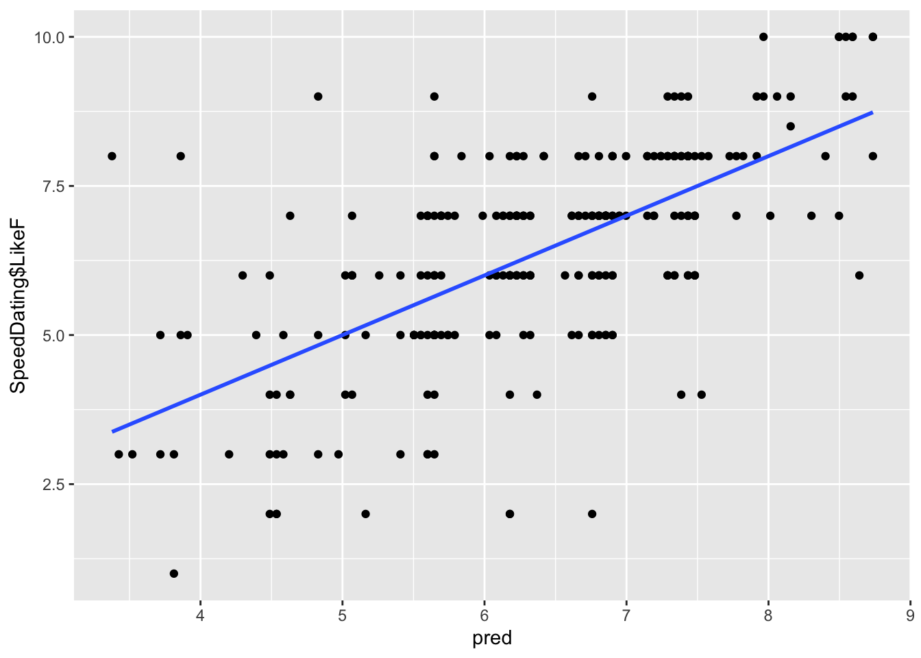gf_point(SpeedDating$LikeF ~ pred) %>%gf_lm()