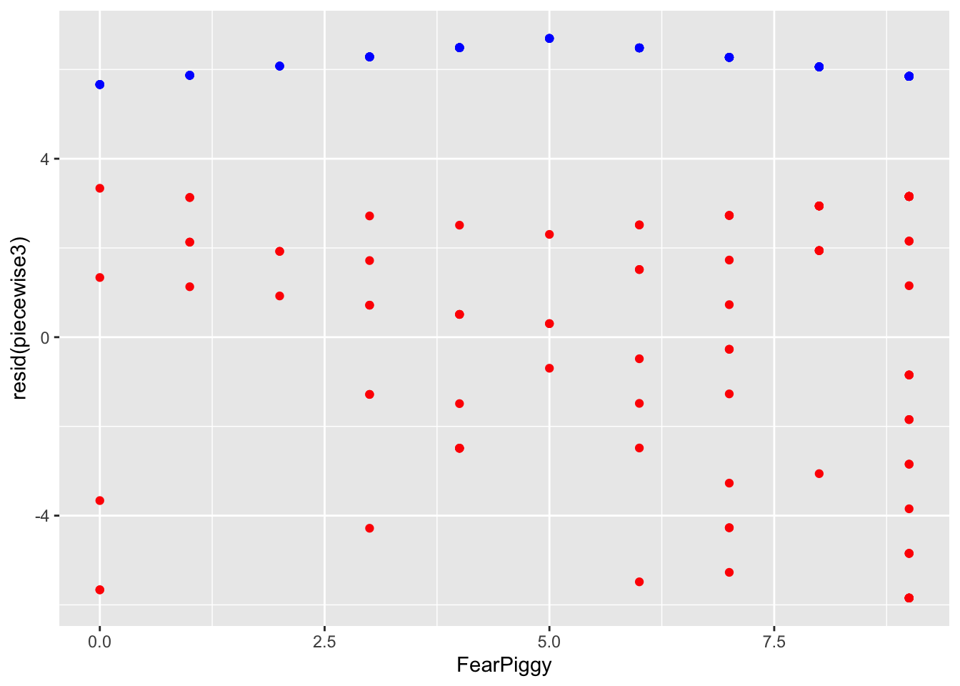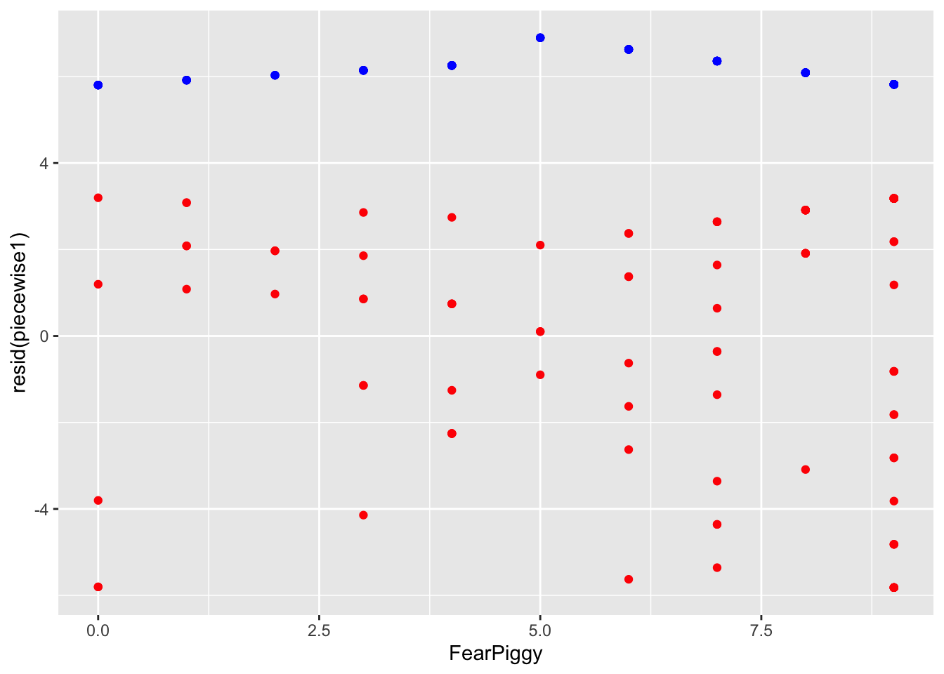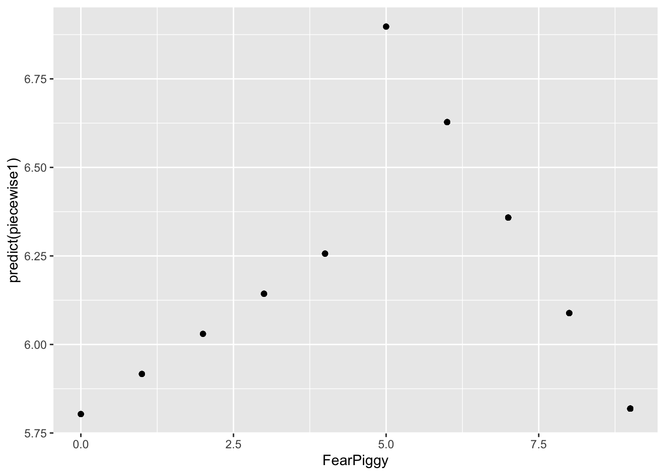Unlike the segmented piecewise model, this model connects when FearPiggy equals 5! You can imagine the Y-axis splitting at FearPiggy = 5, with one line going left and one going right - both meeting at the same intercept at the joint.