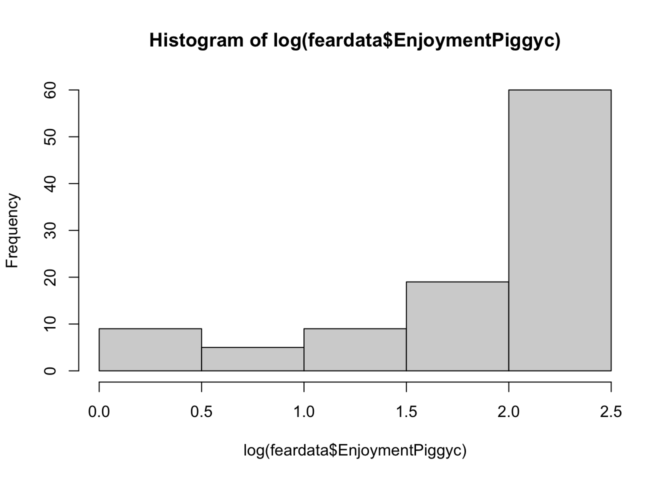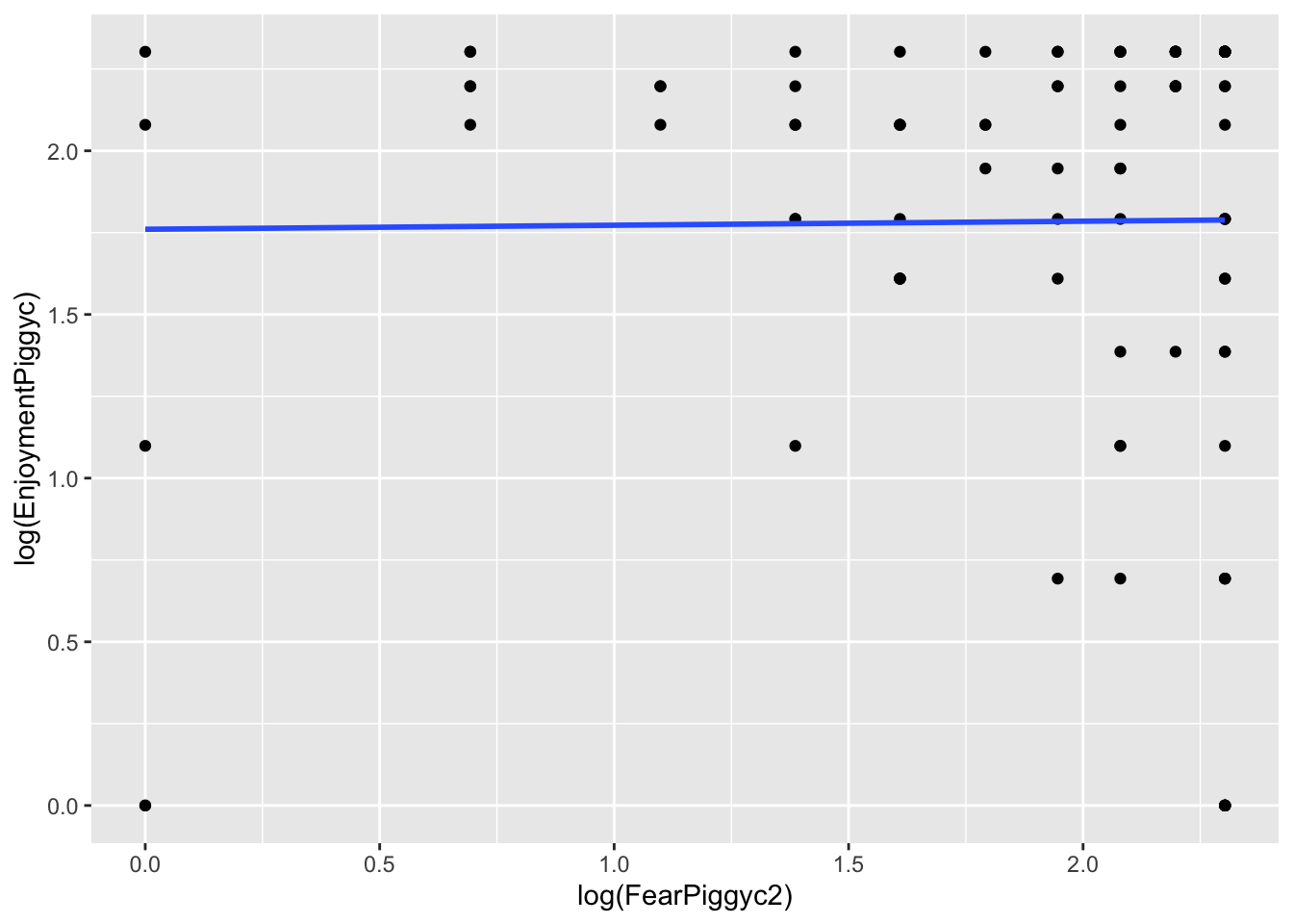 lm(formula = log(EnjoymentPiggyc) ~ FearPiggyc2, data = feardata)