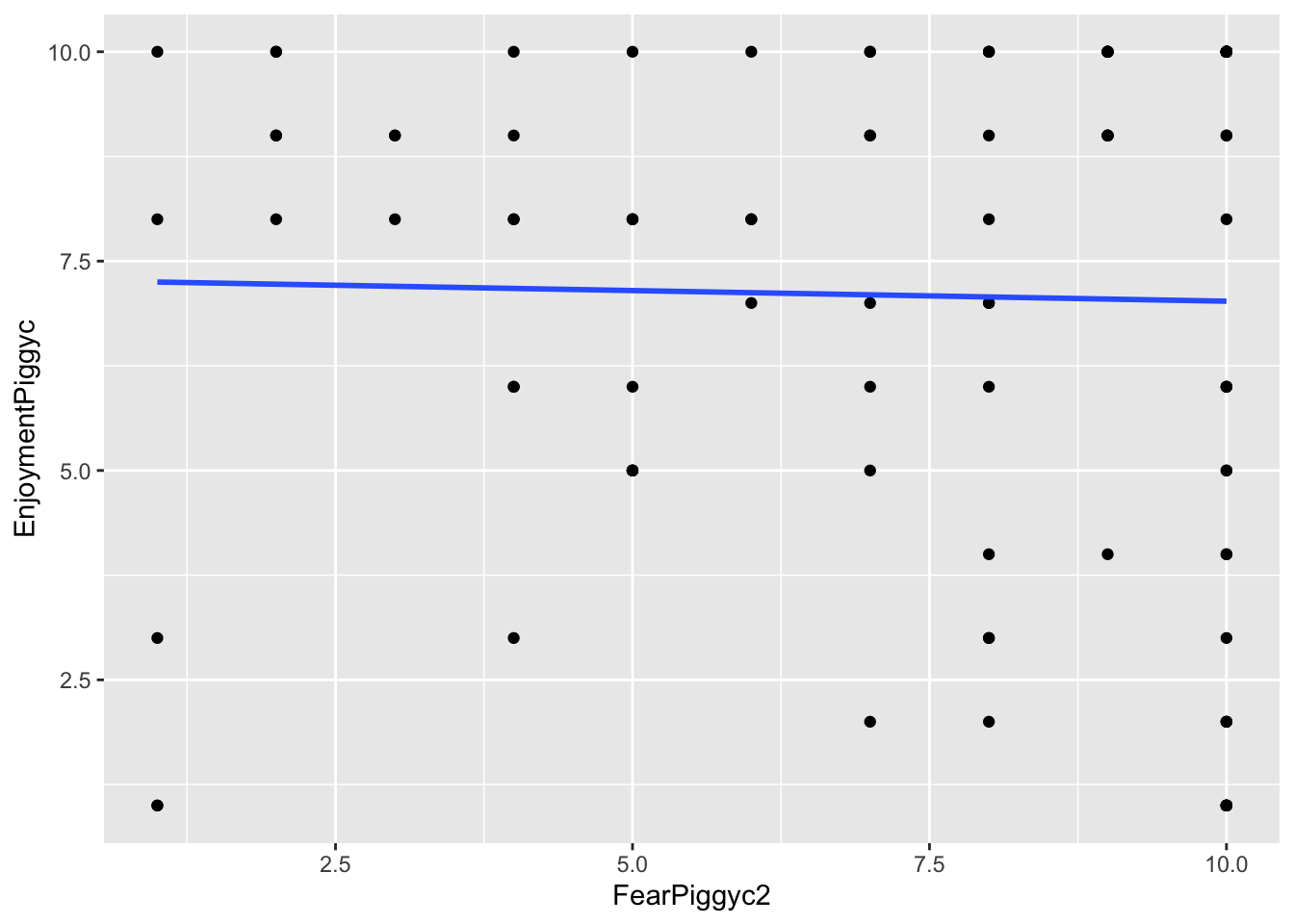 lm(formula = EnjoymentPiggyBEST ~ FearPiggyc, data = feardata)