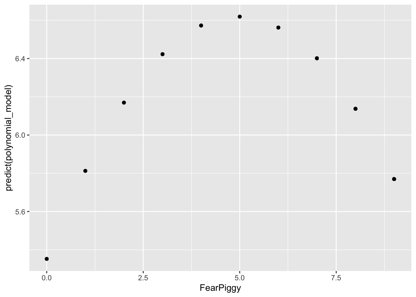 If you want to understand the coefficient intuitively, you can think of the \(X^2\) term as an interaction, where the effect of FearPiggy depends on the level of FearPiggy itself. Knowing the polynomial coefficient is about -.05, as FearPiggy increases, the effect of FearPiggy on EnjoymentPiggy decreases.