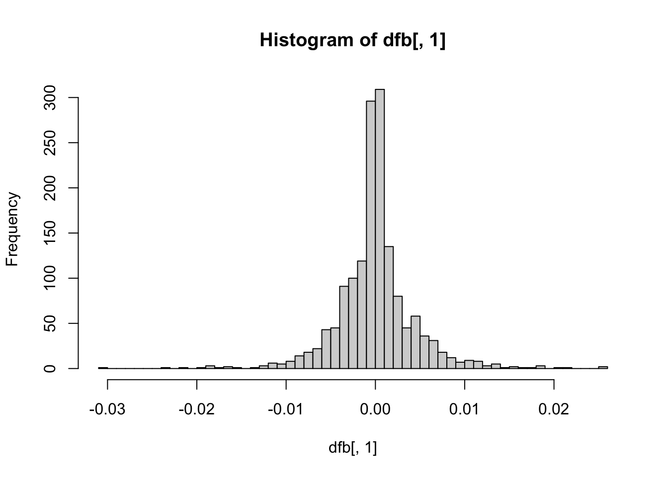 hist(dfb[, 1], breaks = 50) # intercept