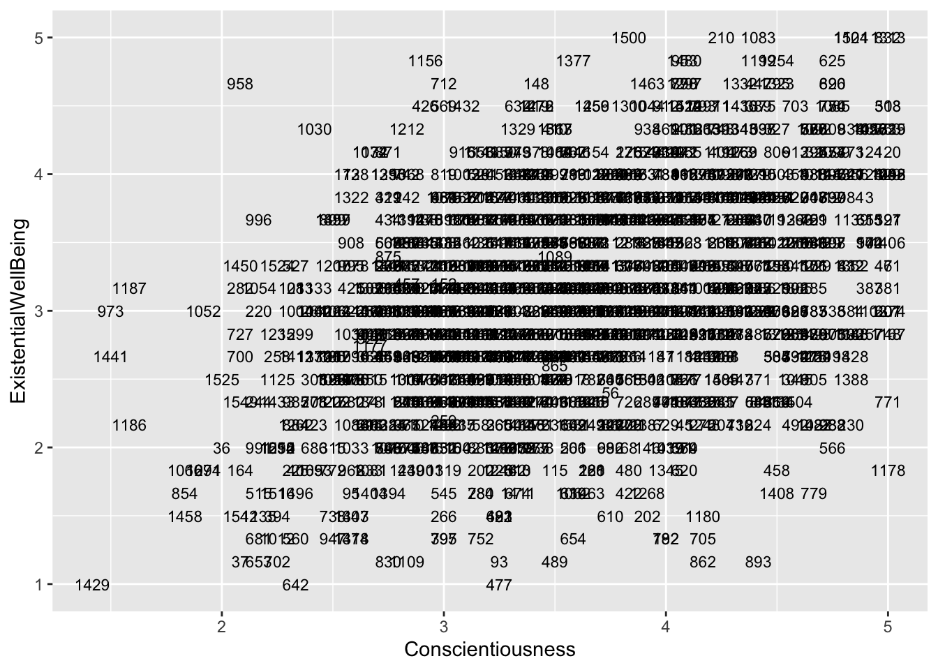 ggplot(aes(x = Conscientiousness, y = ExistentialWellBeing), data = big5) +