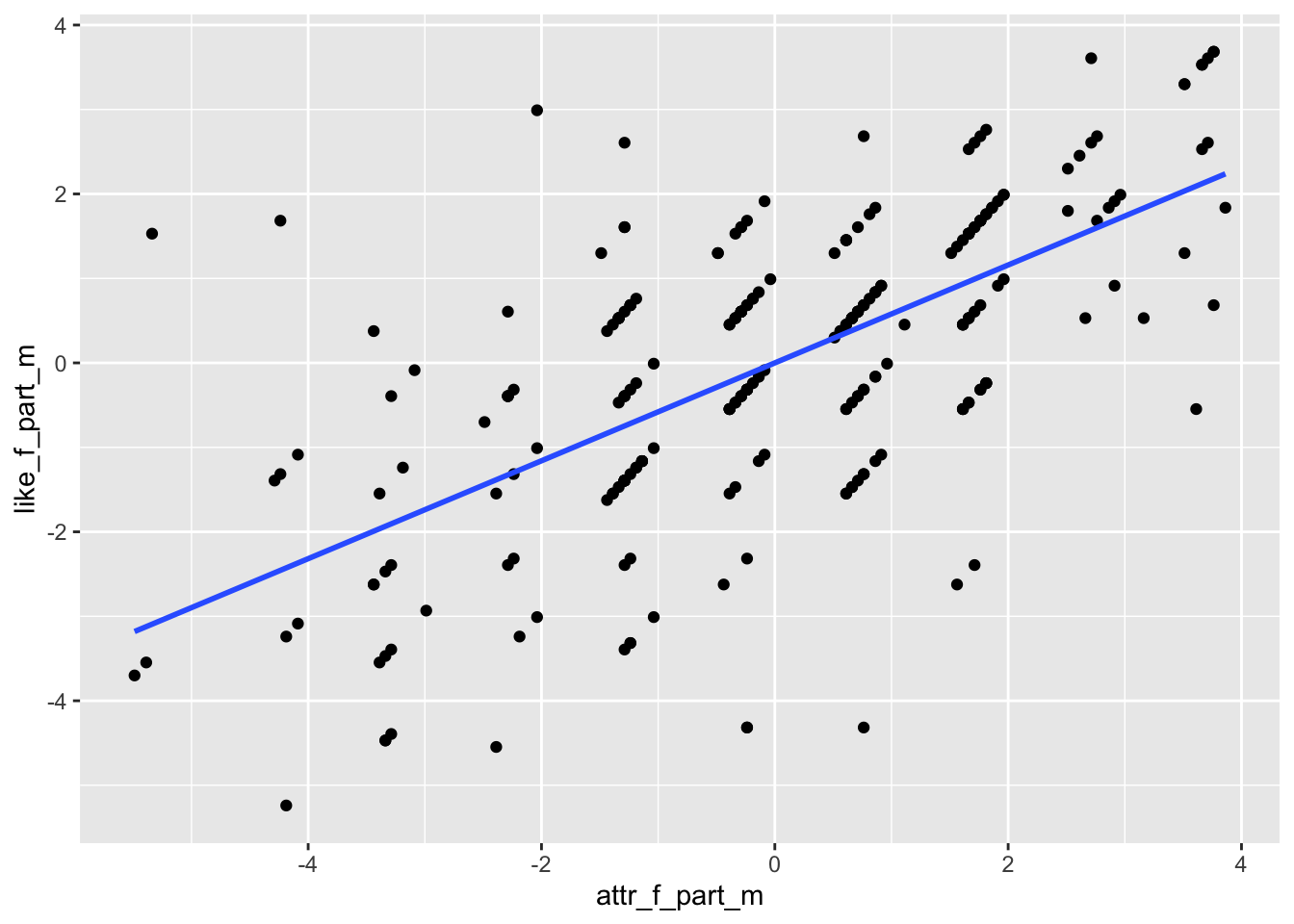 # Plot partialed out LikeF against partialed out AttractiveF (partial correlation)gf_point(like_f_part_m ~ attr_f_part_m) %>%gf_lm()