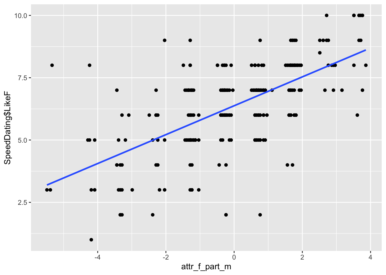 lm(formula = LikeF ~ PartnerYesM + AttractiveF, data = SpeedDating)