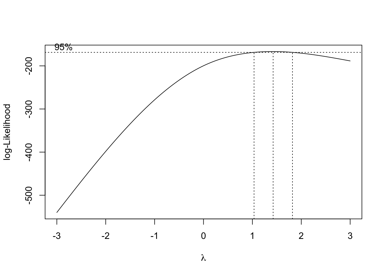 The transformation is controlled by a parameter \(\lambda\), where different values correspond to different transformations (\(\lambda = 1\) is no change, \(\lambda = 0\) approximates a log transformation, \(\lambda = 0.5\) is a square root).