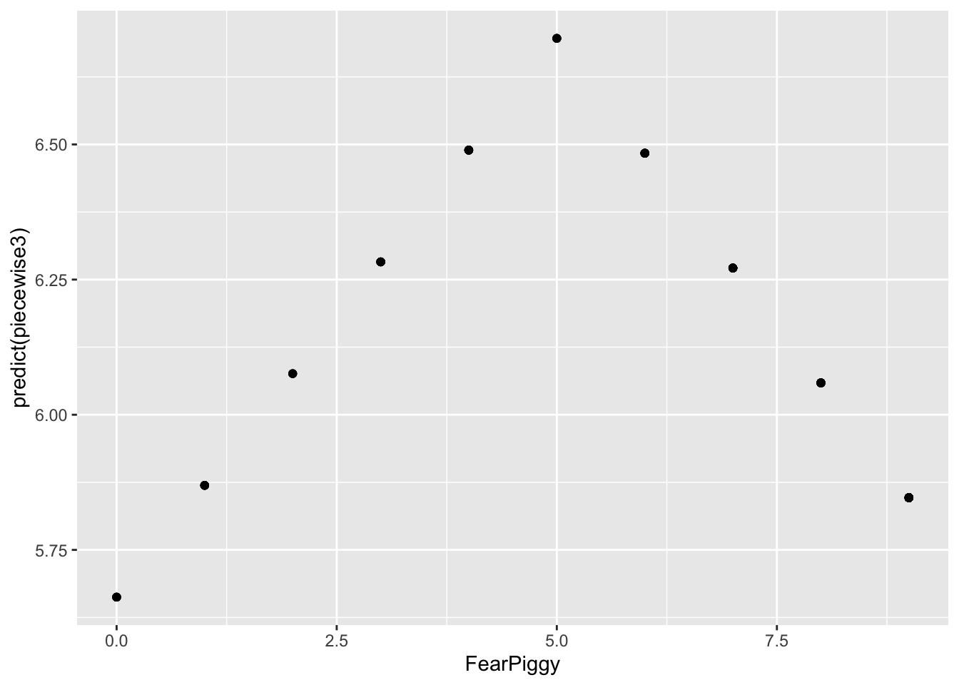 Unlike the segmented piecewise model, this model connects when FearPiggy equals 5! You can imagine the Y-axis splitting at FearPiggy = 5, with one line going left and one going right - both meeting at the same intercept at the joint.