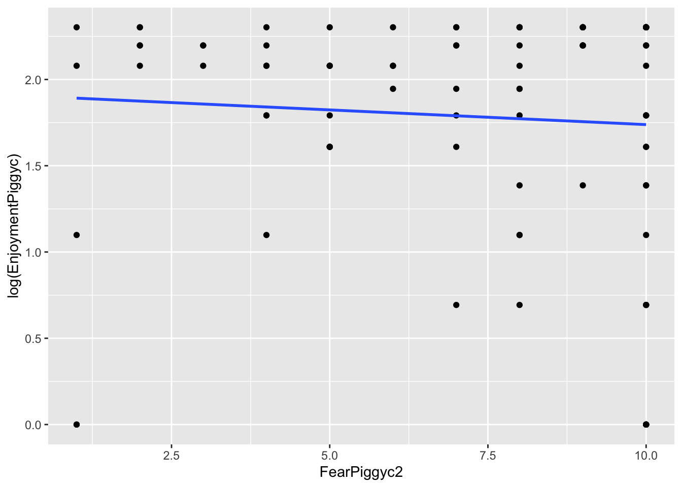 lm(formula = log(EnjoymentPiggyc) ~ FearPiggyc2, data = feardata)