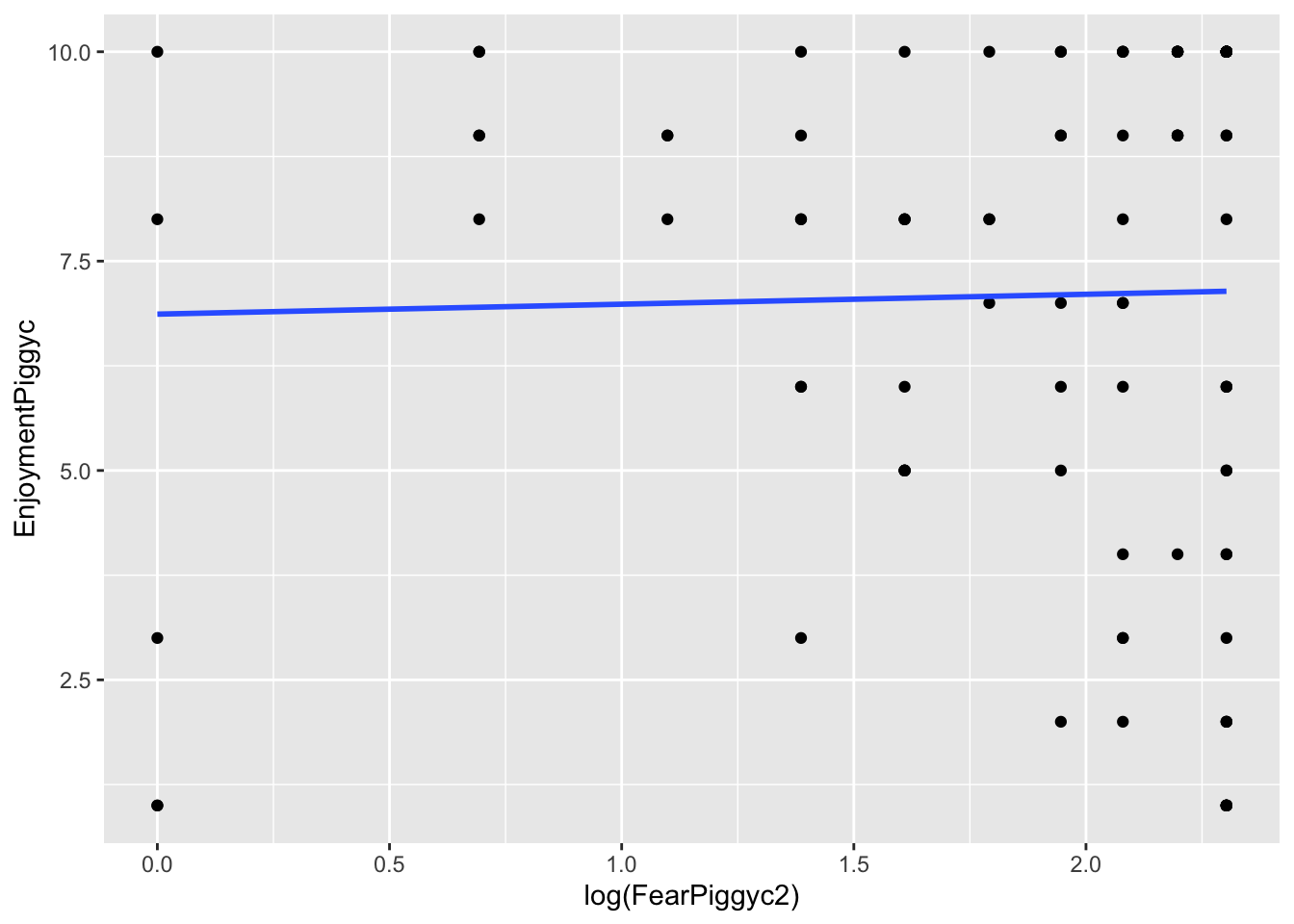 lm(formula = EnjoymentPiggyc ~ log(FearPiggyc2), data = feardata)